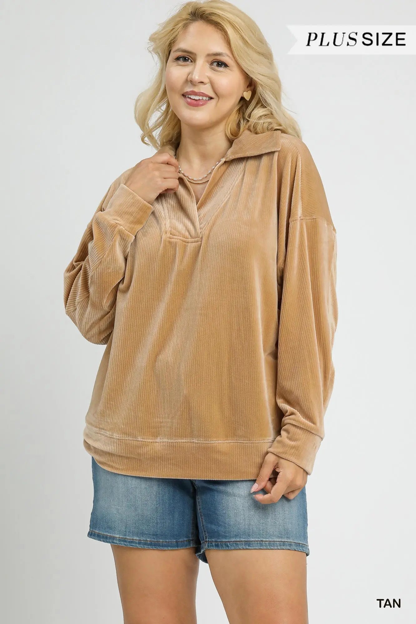 Umgee Brand Plus Size Soft Thermal Collared PullOver V-Neck Ribbed Top