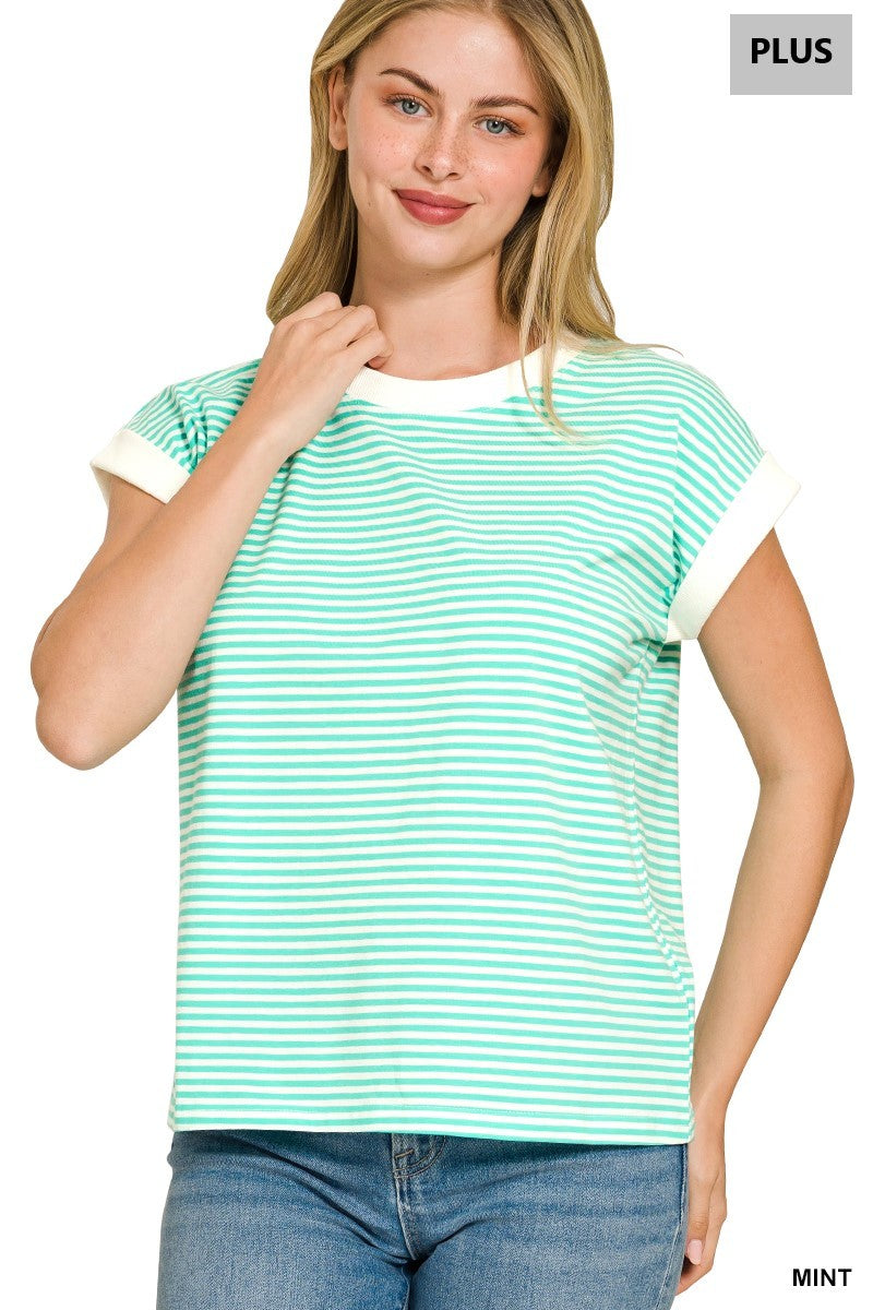 Zenana Brand Plus Size Stripe Contrast Ribbed Band Trim Top