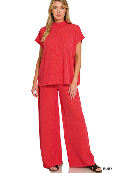 Zenana Brand Raised Ribbed Short Sleeve Mock Neck and Wide Leg 2 Pc Pants Set