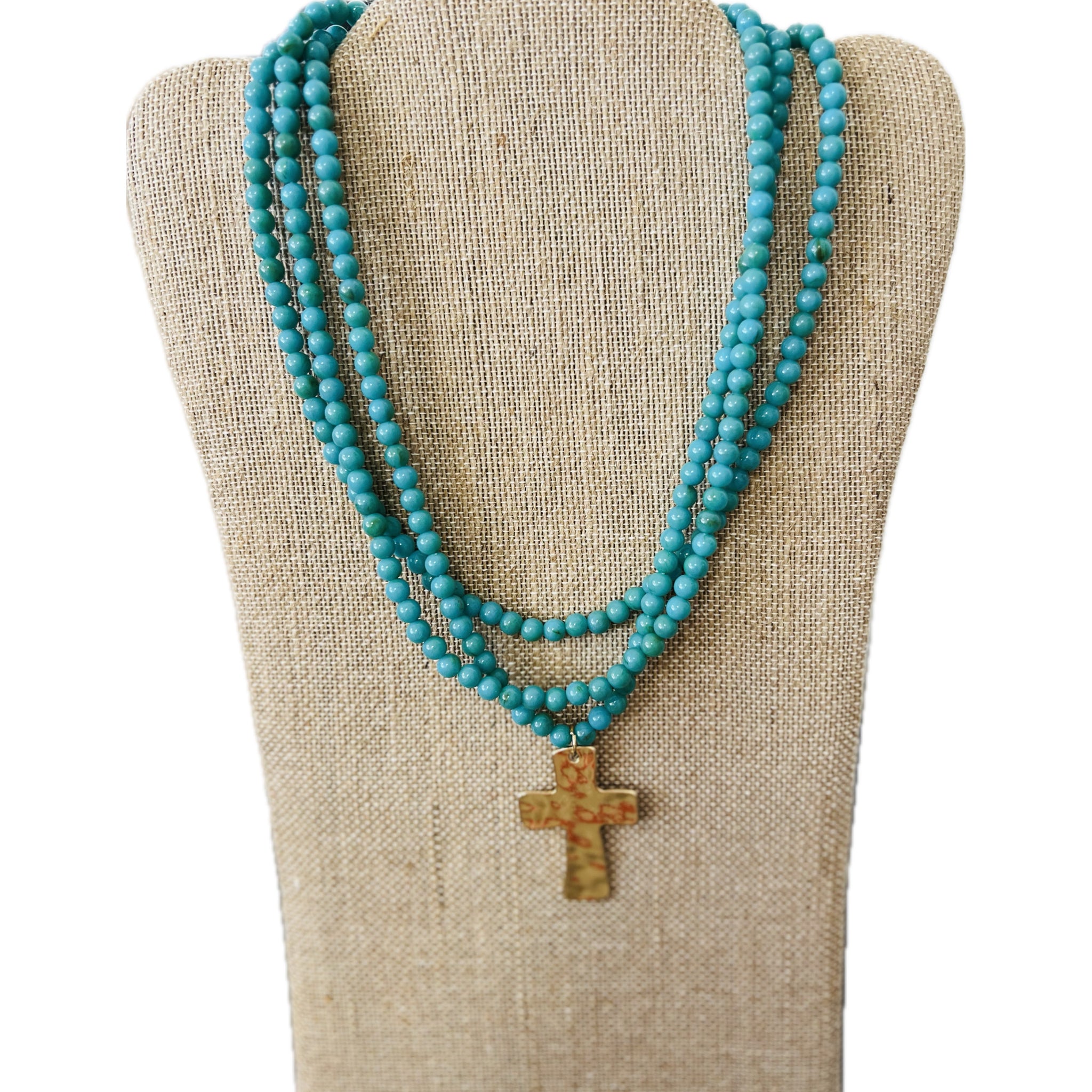 3 Strand Beaded Necklace with Gold Dipped Cross Pendant